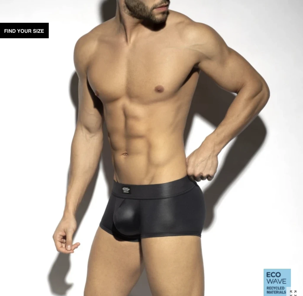 Bóxer de tejido ECOWAVE laminado brillante. Fabricado con 85 % poliamida ECOYARD y 15% elastano. Hilo ecológico de botellas recicladas del Mediterráneo. Etiqueta de silicona de la colección ES en la cinturilla. La prenda perfecta para una ocasión especial.