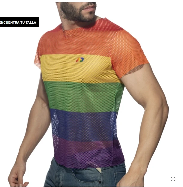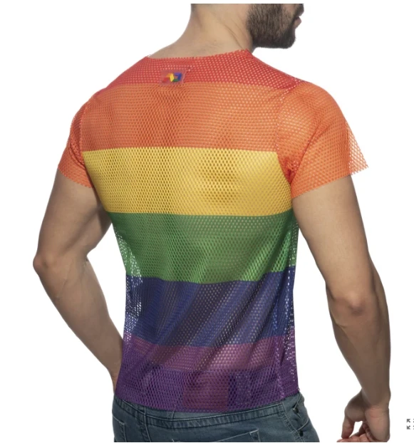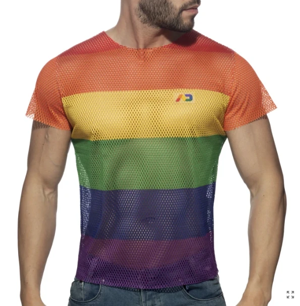 Camiseta de manga corta realizada en rejilla. Composición: 100% Poliéster. Estampada en digital con los colores arcoíris y etiqueta de silicona de AD con colores arcoíris en pecho y espalda. Perfecta para los meses calurosos de verano, fiestas, festivales, etc. Siéntete orgulloso con este espectacular diseño con el que no pasarás inadvertido!